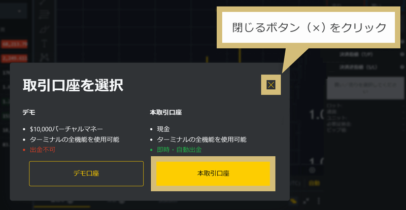 尚、「×」で画面を閉じた場合、Exnessのウェブターミナル(MT4/MT5取引プラットフォームのウェブ版)が自動で表示されます。