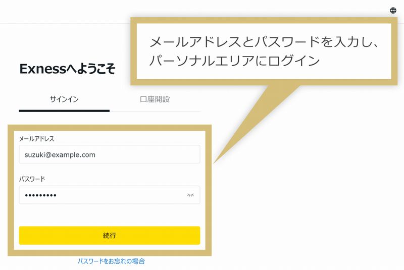 Exnessパーソナルエリアのログインフォームが表示されましたら、