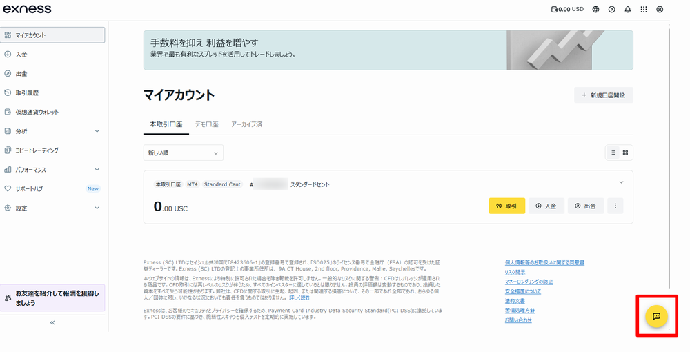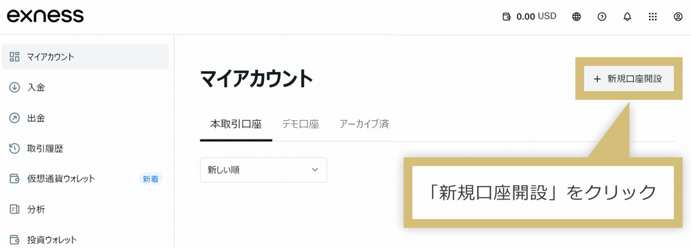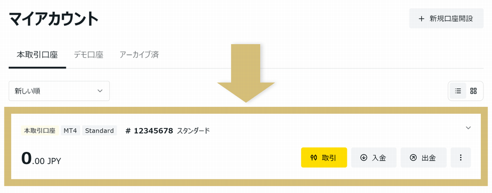 新規口座開設フォームからのお申し込みが正常に完了しますと、Exnessのパーソナルエリアへ自動で遷移し、新規で開設した本取引口座が表示されます。