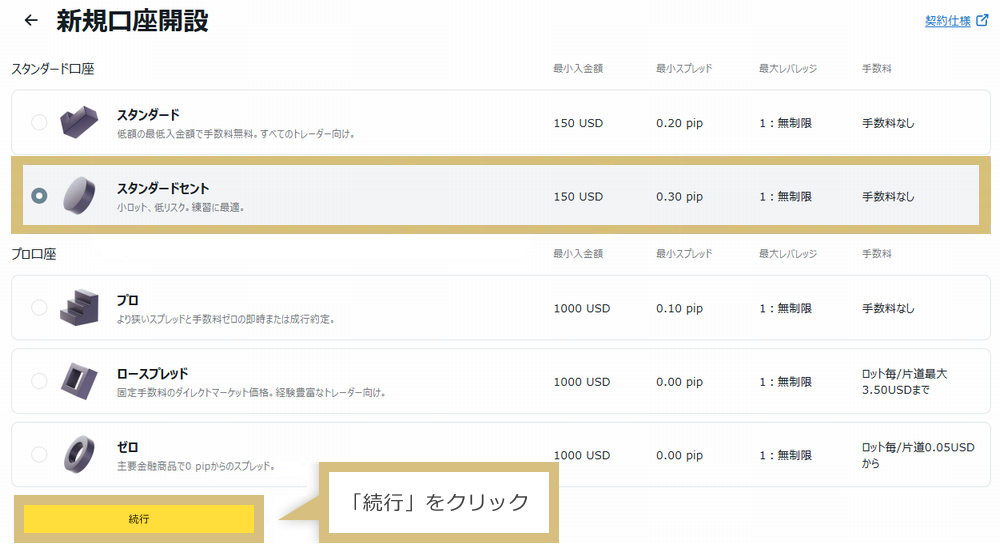 ご希望の取引プラットフォーム(MT4/MT5)と口座タイプを選択(クリック)して「続行」をクリックします。