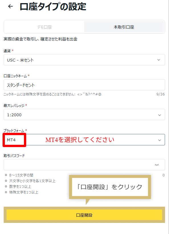 新規口座開設フォームにて開設する本取引口座の条件を選択、または入力して「口座開設」をクリックします。