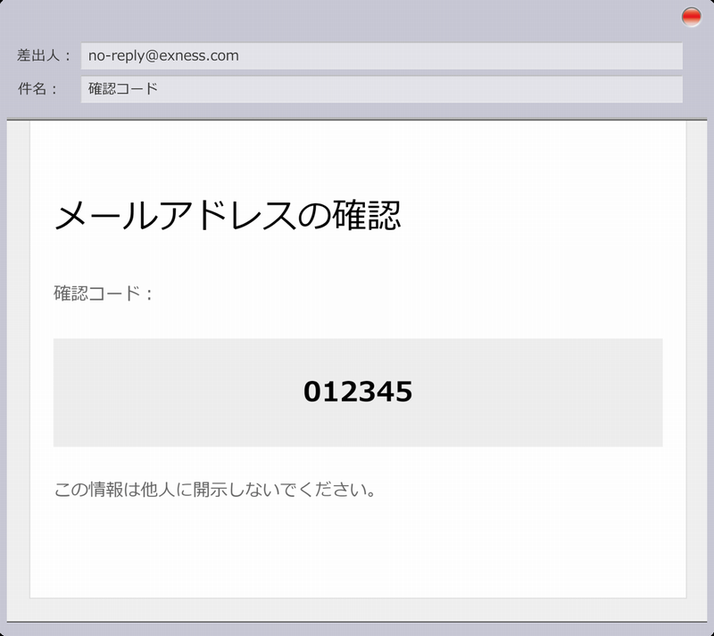 Exness(エクスネス)より、ご登録メールアドレス宛へ「確認コード」という件名のメールが送信されます。
