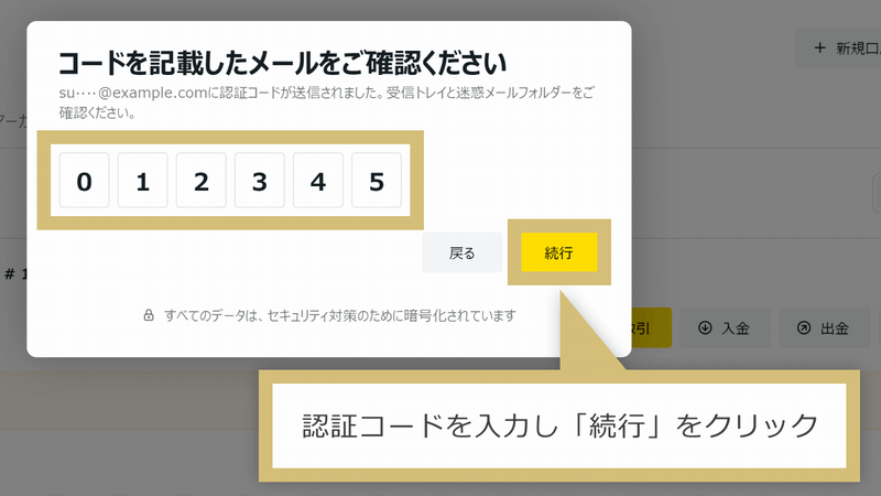 メールからの認証コード欄に、メールに届いた確認コードを入力し、「続行」をクリックしてください。