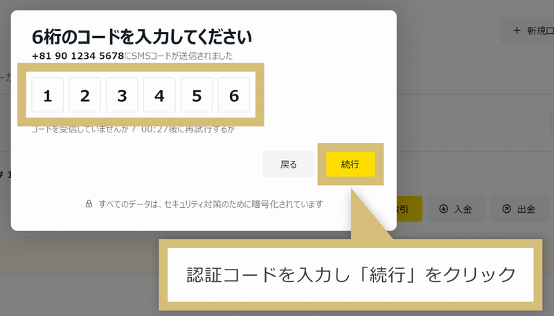 認証コード欄に、SMSへ届いた認証コードを入力し、「続行」をクリックします。