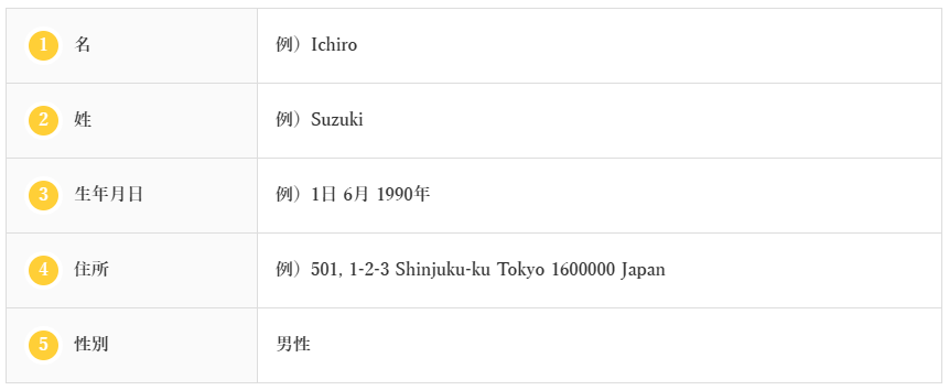 ①名・②姓は、お客様のお名前をアルファベットで入力します。