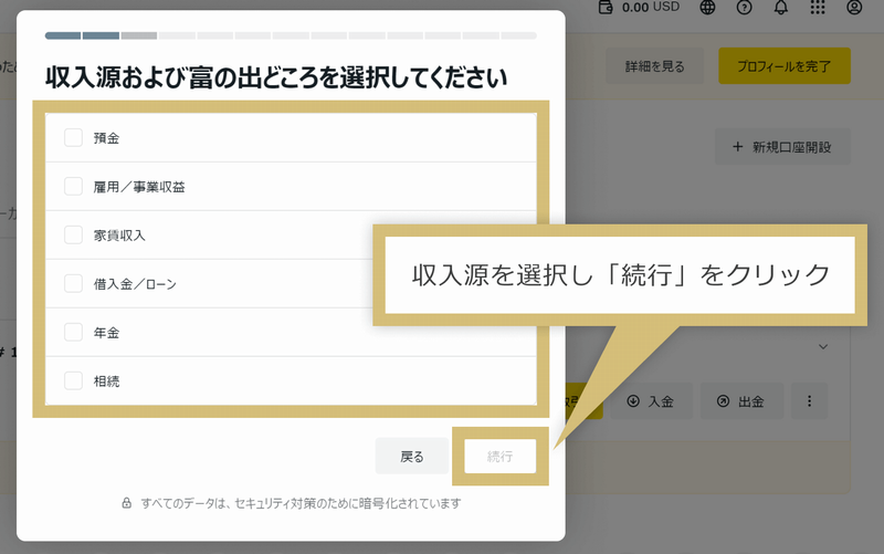 「収入源および富の出どころを選択してください」の画面が表示されましたら、