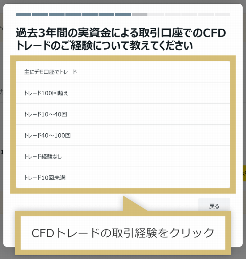 「過去3年間の実資金による取引口座でのCFDトレードのご経験について教えてください」の画面が表示されましたら、