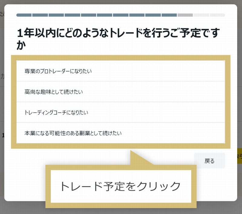 「1年以内にどのようなトレードを行うご予定ですか」の画面が表示されましたら、