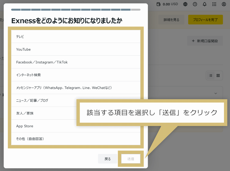 Exnessを知ったきっかけを選択し、「送信」をクリックします。