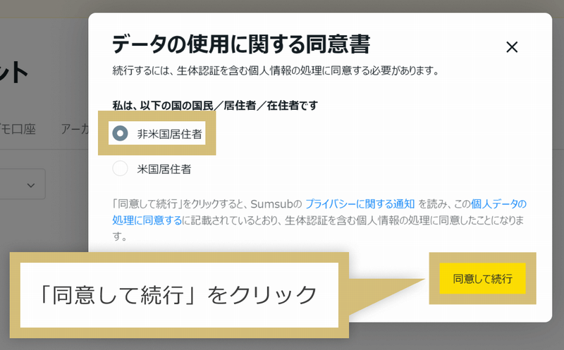 「非米国居住者」を選択し「同意して続行」をクリックします。