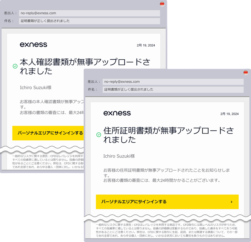 「証明書類が正しく提出されました」という件名のメール(本人確認書類/住所証明書類)が送付されます。