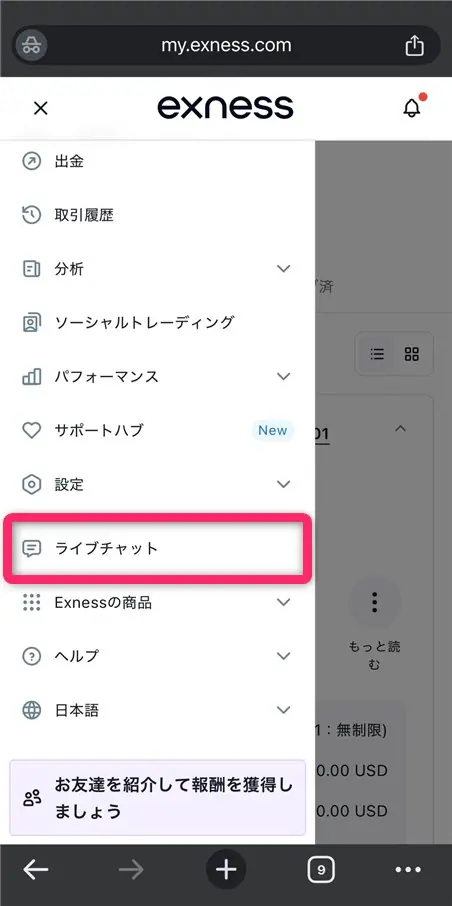 スマホの場合は左上のメニューにある「ライブチャット」をタップします。