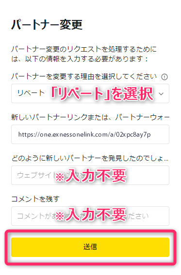 「パートナー変更理由」と「パートナーリンク」の2点だけを入力して送信ボタンを押しましょう!