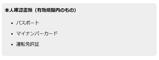 公的機関が発行する有効期限内の顔写真付き本人確認書類(パスポート、マイナンバーカード、運転免許証、在留カード等)と、