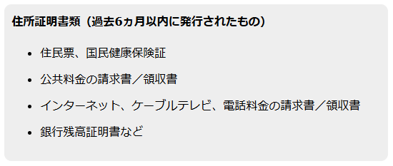 6カ月以内に発行された住所証明書(住民票・印鑑登録証明書・公共料金請求書・銀行取引明細書等)